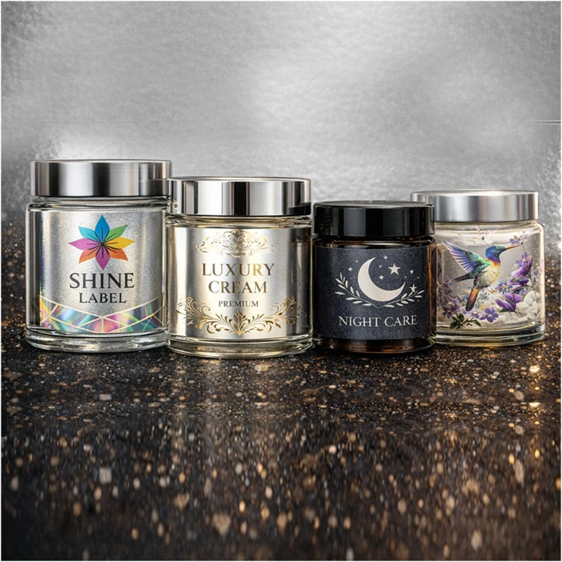 - Transparente Folie: CMYK-Druck ohne weißen Unterdruck ist teilweise transparent – die Farben „lassen“ den Hintergrund durchscheinen und nehmen die Farbe der Oberfläche an, auf die das Etikett geklebt wird.